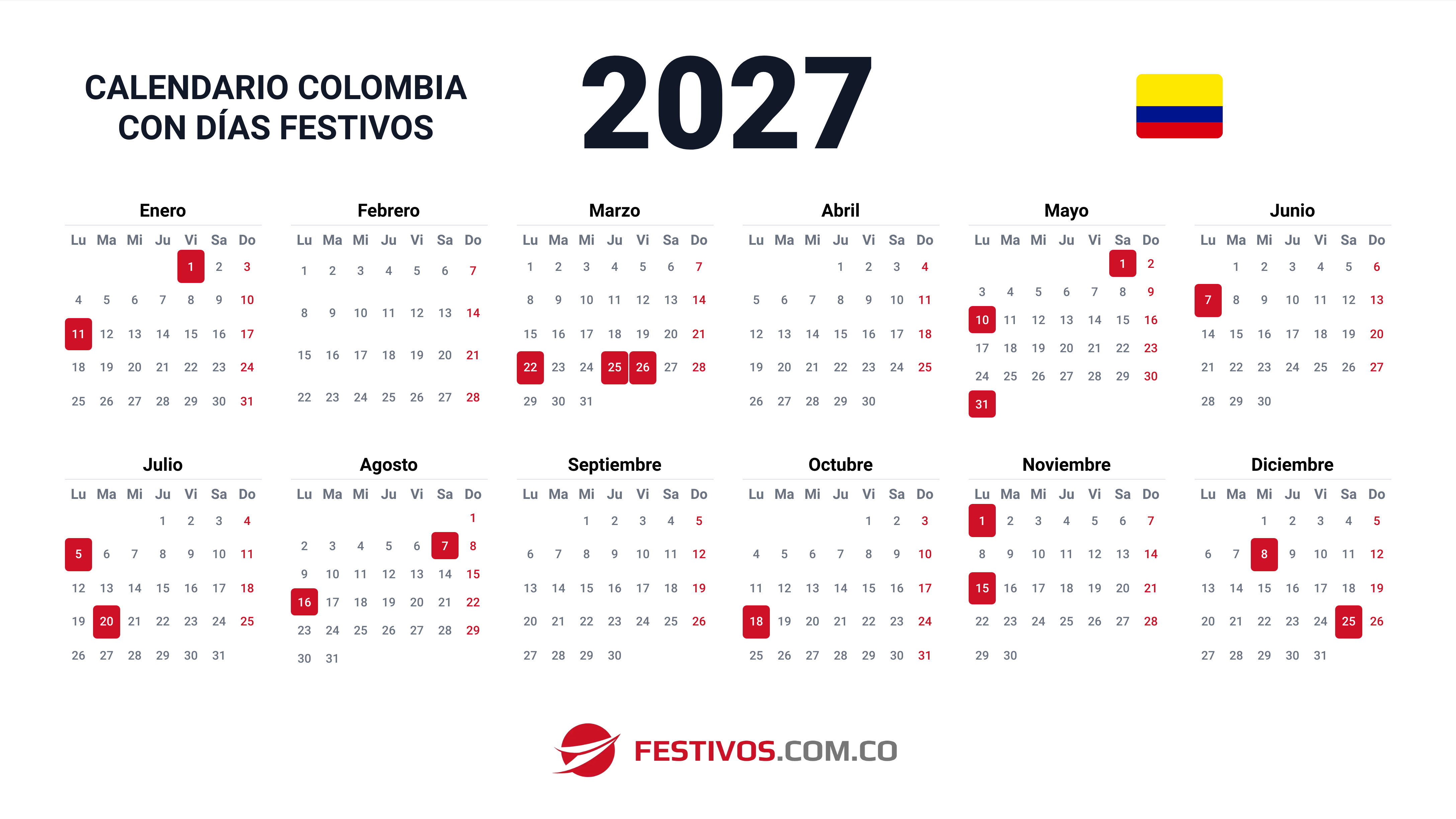 Este calendario muestra todos los días festivos en Colombia para el año 2027. Verificamos y actualizamos la información constantemente, pero los festivos de los próximos años se basan en la legislación actual y pueden experimentar modificaciones. Te sugerimos revisar esta página de manera frecuente para confirmar la vigencia de los datos.
